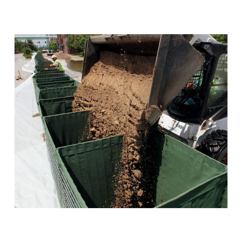 Eine mit Geotextil ausgekleidete, wiederverwertbare Einheit für den allgemeinen Einsatz als erdgefüllte Barriere.Die Einheiten eignen sich für die Befüllung mit Erde, Sand, Kies, zerkleinertem Gestein und anderen Granulatmaterialien.Die Einheit erfüllt eine Vielzahl von Anwendungen,einschließlich der Errichtung von Schutzmauern und Barrieren.